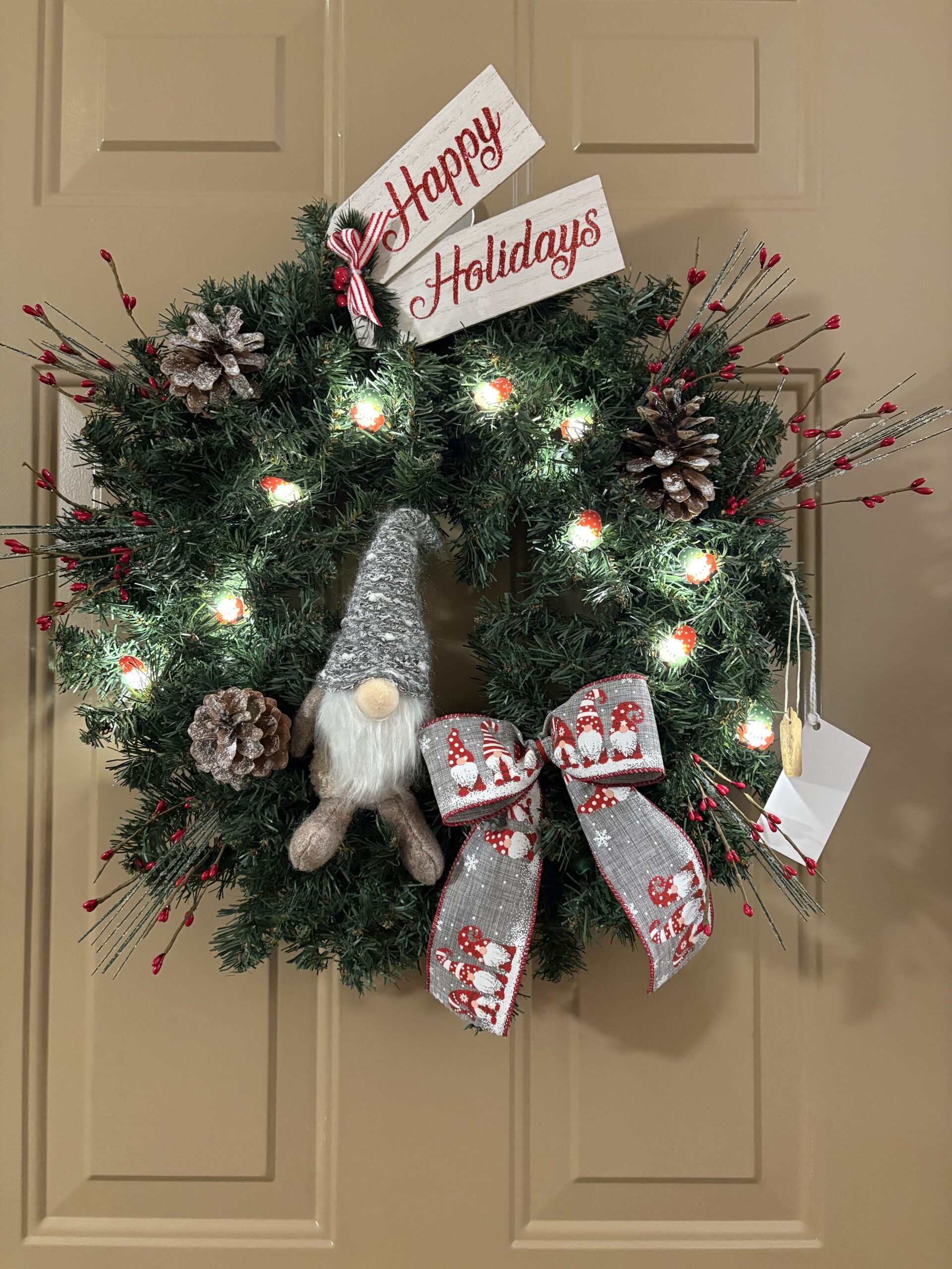 This Happy Holidays Wreath has a gnome sitting off to one side, surrounded red picks, pine cones, and mini gnome lights. The ribbon is also little gnomes. A wood Happy Holidays sign tops it off.