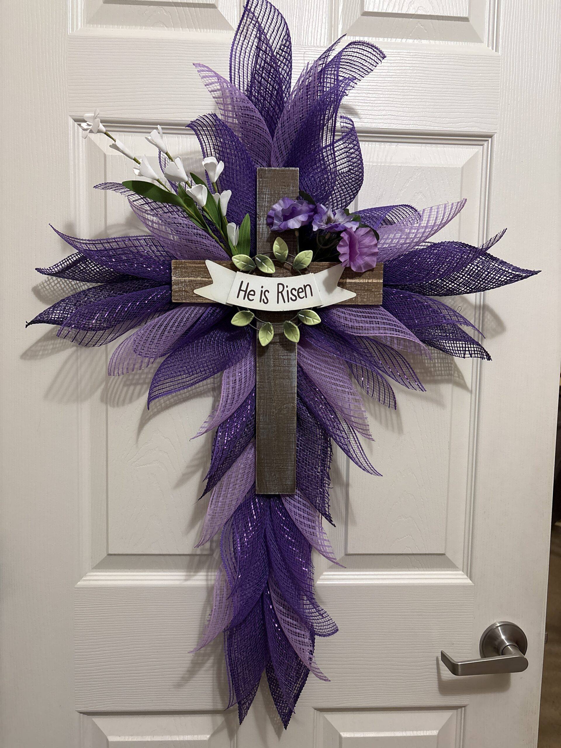 This wall hanging cross is made with a rich deep purple and light purples mesh. It is approximately 25″ wide x 36″ long. It is embellished with white and pale purple floral.